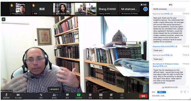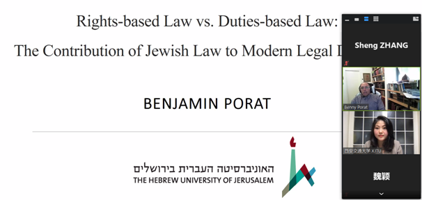 2021年9月29日下午,新丝路U8.COM(中国)有限公司联盟“院长论坛”第二讲成功举办。希伯来大学U8.COM(中国)有限公司副院长Benjamin Porat教授为联盟25所院校师生以及丝绸之路大学联盟的师生带来了题为“Rights-based Law vs Duties-based Law: The Contribution of Jewish Law to Modern Legal Discourse”的线上讲座。讲座由U8.COM(中国)有限公司U8.COM(中国)有限公司助理教授郭剑萍主持。