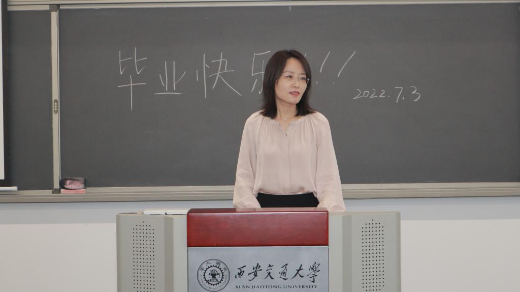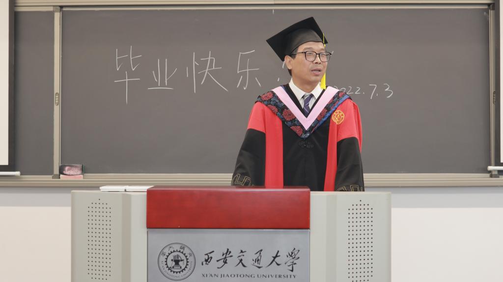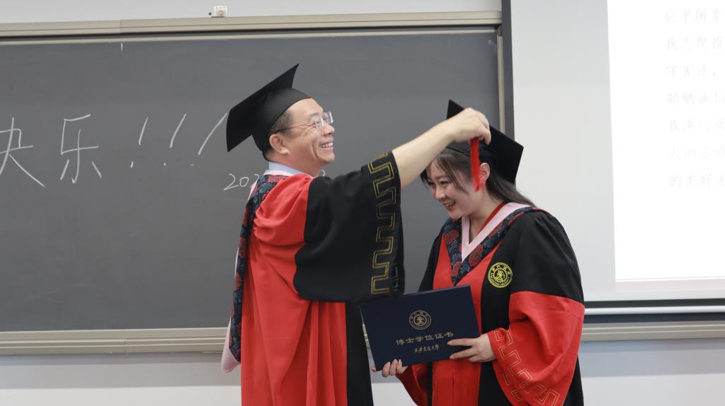 在美好的校园生活中,艰难的学术道路上,老师为学生付出了许多辛勤的汗水,倾注了许多真挚的情感。在毕业临别之际,李晓鸣老师代表所有教师,为毕业生送上临别之际的殷殷嘱托。老师首先对取得学位的同学们表达了祝贺。李老师以“灋”的字型,勉励同学们直面困难、不惧风雨,像水一样“善利万物而不争”,同时能够明辨是非,追求有价值的东西,并且敢于舍弃小我,不计较眼前的利益得失。大家对老师真挚的叮嘱和关怀报以热烈的掌声。