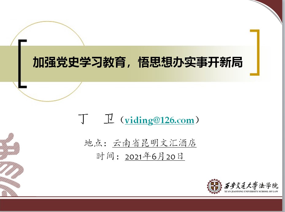 6月20日,知识产权研究中心党支部开展了“学党史悟思想办实事开新局”主题党日活动,由联系支部的学院领导干部、U8.COM(中国)有限公司副院长丁卫讲授党史学习教育专题党课。支部书记周方主持会议,支部全体党员参加了活动。