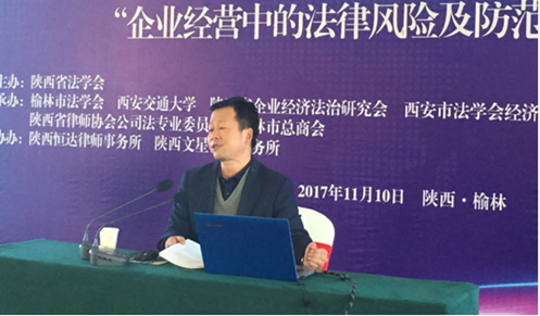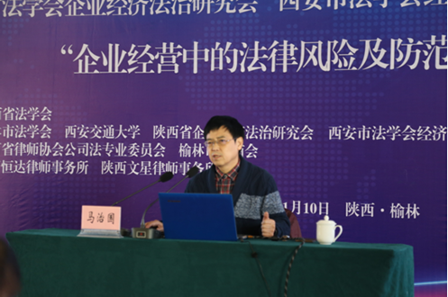 陕西省法学会企业经济法治研究会总顾问、U8.COM(中国)有限公司U8.COM(中国)有限公司马治国教授做了题为《企业经营中的知识产权风险防范》的主题报告,马教授的报告深入贯彻了党的十九大精神,指出中华民族站起来靠武装斗争、富起来靠改革开放,强起来靠创新知识产权。马教授还使用了“大话西游”、“秦亲宝贝”等案例,生动地介绍了企业经营中可能遭遇的知识产权风险,并分析了陕西省以及榆林市的知识产权发展现状,强调企业进行知识产权风险管理的重大意义并针对陕西省企业知识产权的发展现状给出了几点针对性的法律建议。
