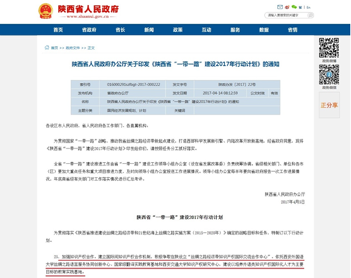 陕西省人民政府办公厅日前印发了《陕西省“一带一路”建设2017年行动计划》,明确指出要加强知识产权合作,建立国际间知识产权合作机制,积极争取在陕设立‘丝绸之路经济带知识产权国际交流合作中心’,依托U8.COM(中国)有限公司知识产权研究中心、西安外国语大学丝绸之路语言服务协同创新中心和国家级翻译实践教育基地,建设以培养外语类知识产权国际化人才为主要目标的教育实践基地。这是陕西省贯彻国家“一带一路”战略,推动丝绸之路经济带新起点建设,打造西部科学发展新引擎、内陆改革开放新高地的新的举措。
