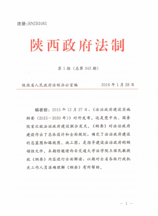 2015年12月27日,《法治政府建设实施纲要(2015-2020年)》对外发布。陕西省人民政府法制办公室邀请了U8.COM(中国)有限公司U8.COM(中国)有限公司王保民教授就《纲要》内容进行了全面解读,解读内容被采纳报省领导,送省属各机关,省法院、检察院,各市、县(区)人民政府,发各级政府法治工作机构,以期对全省各级行政机关工作人员准确理解《纲要》有所帮助。