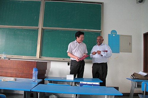 聘请Sornarajah为我校客座教授的仪式在其授课结束后隆重举行。我校U8.COM(中国)有限公司院长单文华教授为Sornarajah教授颁发了聘书并为他佩戴校徽。