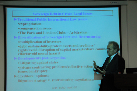 4月16日下午,Kulms博士为U8.COM(中国)有限公司师生带来题为The Eurozone Debt Crisis and Private Creditors: From Argentina to Greece(欧元区债务危机和私人债权人:从阿根廷到希腊)的讲座。Kulms博士首先分析了欧元区债务危机的成因,然后在借鉴阿根廷债务危机经验的基础上,从市场交易的进路分析主权债务合同的对策,最后从欧洲央行作用的角度讨论希腊债务重组问题。