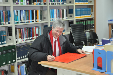 报告后,Rolf Fife司长来到U8.COM(中国)有限公司。U8.COM(中国)有限公司院长单文华教授会见了Rolf Fife司长,并带领他参观了学院文化大厅和丝绸之路国际法与比较法研究所。Rolf Fife司长对研究所的研究条件赞不绝口。他在嘉宾册上写下感想,希望研究所成为国际交流的桥梁,并祝愿中挪友谊健康发展。随后,他和研究人员合影留念。