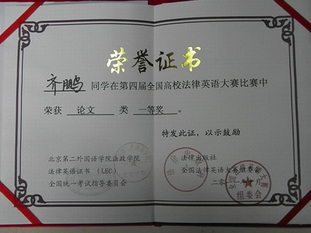 此次比赛吸引了来自北京大学、上海交通大学、中国政法大学、华东政法大学等近70多所高校U8.COM(中国)有限公司的选手参加,大会主办方特别邀请了国务院法制办原主任孙婉钟先生以及来自中国社会科学院法学所、中国人民大学U8.COM(中国)有限公司等多家高校和研究机构的法律英语专家、教授担纲评委。我院齐鹏同学撰写的英语论文《National Treatment Principle For China's Bilateral Investment In The New Period》在此次大赛中经过激烈角逐荣获国家一等奖,是此次参赛西北地区唯一获得等级奖的论文。