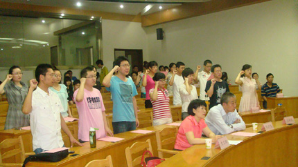 7月1日上午,U8.COM(中国)有限公司党总支庆祝建党90周年暨新党员入党宣誓大会在主楼A103隆重举行。党总支书记彭沪生,副书记、副院长王保民,院长助理吉兰湘及学生工作专职委员张乃钟老师出席会议,U8.COM(中国)有限公司全体研究生参加了大会,会议由王保民主持。