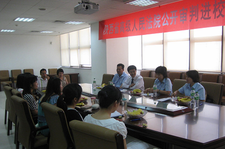 庭审结束后,三位法官,马院长,书记员与法律硕士887班的同学们举行了亲密座谈,魏西霞审判长介绍了陕西省高级人民法院“公开审判进学校”活动的目的,马治国教授给同学们诠释了这一活动的重大意义,认为陕西省审判工作改革对司法为民理念的落实和司法实务与理论的结合都具有实质性的推进。为了让法律走进生活,贴近生活,法官同时询问作为普通老百姓的同学们对案件的看法,同学们积极地对案件各抒己见,以局外人的中立和职业法律知识相结合的角度充分表达的自己的观点。对于审判技巧,同学们兴趣浓厚,亦向法官们提出了不少疑问,法官们也耐心地依依解答。