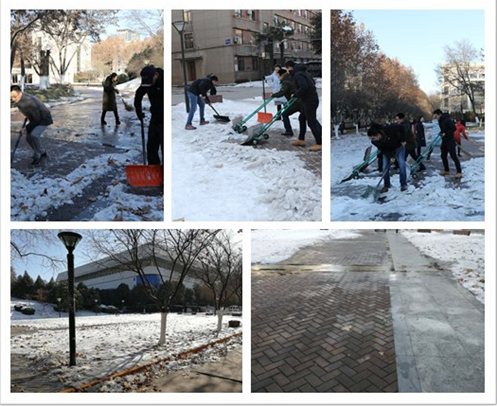 民主生活会后,据老师反映主楼西南角道路上尚有积雪,给到主楼办事的师生带来不便。在支部的倡议下,党员们立即行动起来,清扫积雪。这条道路是校车站通往主楼的必经之路,路面上冰雪较厚,清理起来十分费劲,但支部党员不畏困难,埋头就干,铁锹扫把齐上阵,干的热火朝天。在大家的齐心协力下,一条宽阔干净的道路很快就被清扫出来。看着自己的劳动果实,大家表示这样的活动十分有意义。