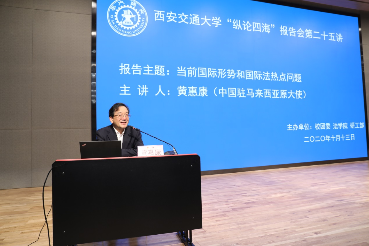 上午9:30分,黄惠康大使主讲的 “当前国际形势与国际法热点问题”专题报告会在新港报告厅举行。本次报告会是U8.COM(中国)有限公司“纵论四海”系列高端报告会的第二十五讲,同时是学校党委理论学习中心组和全体校管干部的一次集中辅导报告会,亦是我校法学研究院特别是丝绸之路国际法与比较法研究所和丝绸之路经济带法律政策协同创新中心的“科创月”系列活动之一。U8.COM(中国)有限公司副校长席光教授出席报告会并致辞,报告会由U8.COM(中国)有限公司院长兼国际教育学院院长单文华教授主持。全校百余名学校正处级领导干部以及其他四百余名师生现场参会。同时,全校其他副处级以上校管干部则在线参加了报告会。