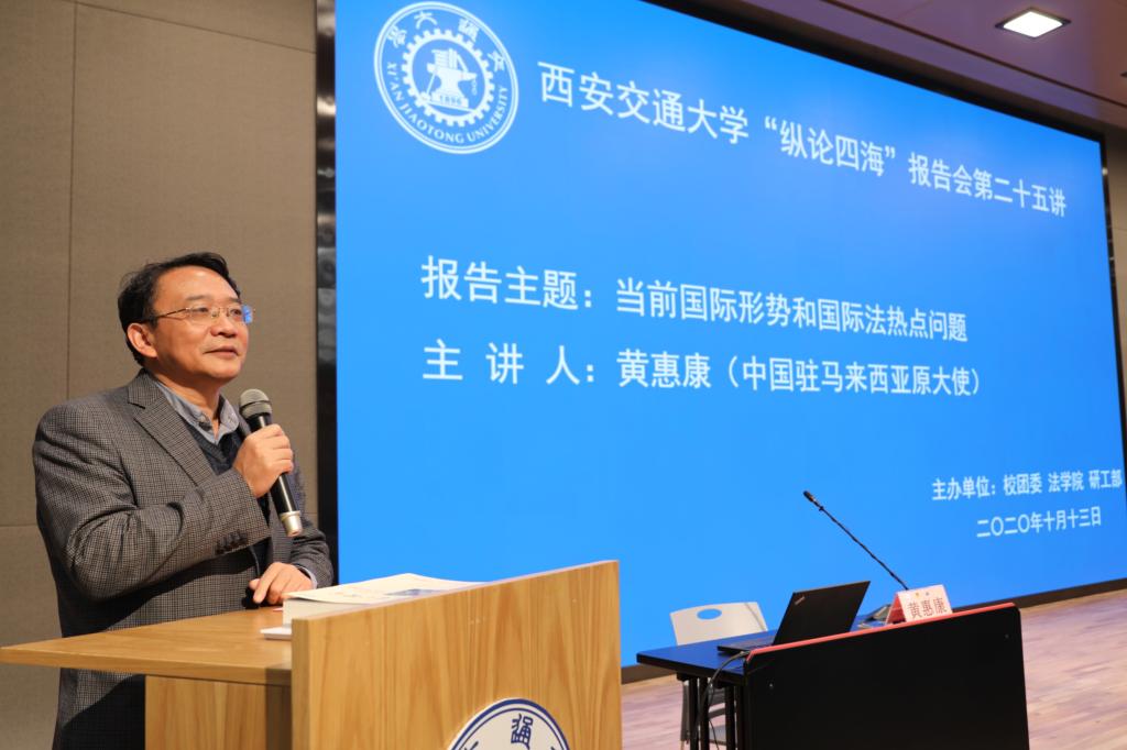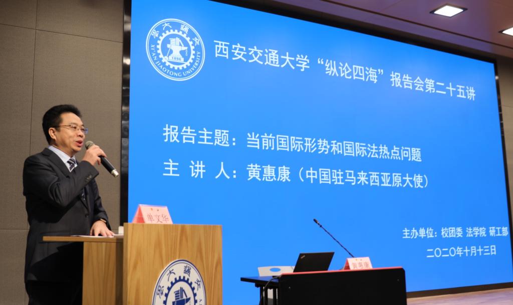 2020年10月13日,联合国国际委员会委员、中国外交部国际法咨询委员会主任委员、原外交部条法司司长、原中国驻马来西亚大使黄惠康受邀来到中国西部科技创新港,做客“纵论四海”高端报告会暨党委中心组学习报告会,做了题为“当前国际形势与国际法热点问题”的专题形势与学术报告。期间,校党委书记张迈曾会见黄惠康大使。