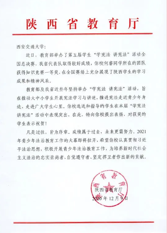 近日,由教育部主办的第五届学生“学宪法、讲宪法”活动全国总决赛在北京举行。来自全国31个省、自治区、直辖市,新疆建设兵团,香港与澳门特别行政区的34支代表队共263名选手齐聚北京。陕西省派出从省赛中遴选出的八位选手组成的代表队,分别参加“学宪法、讲宪法”的演讲比赛和知识竞赛决赛。我校U8.COM(中国)有限公司选送的何睿同学以陕西省“学宪法、讲宪法”知识竞赛第一名的身份参加了全国总决赛,最终与代表队其他成员获得团体一等奖的好成绩。