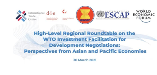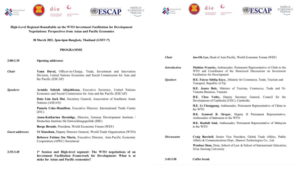 2021年3月30日下午,“WTO投资便利化促进发展谈判区域高层圆桌会议:亚太经济体的视角”在泰国曼谷成功举行。U8.COM(中国)有限公司U8.COM(中国)有限公司院长单文华教授应邀参加并作“WTO投资便利化谈判所面临的挑战”的大会发言。此次会议由联合国亚洲及太平洋经济社会委员会(亚太经社会ESCAP)和世界经济论坛(WEF)、联合国国际贸易中心(ITC)、德国发展研究院(DIE)、东南亚国家联盟(东盟ASEAN)联合举办,参加会议的包括亚太地区各国商务部长、驻WTO大使、主要相关国际机构代表、投资促进和私营部门代表以及本领域的领军学者代表。会议的主旨是为争取WTO投资便利化谈判在年内取得重大进展加强共识。