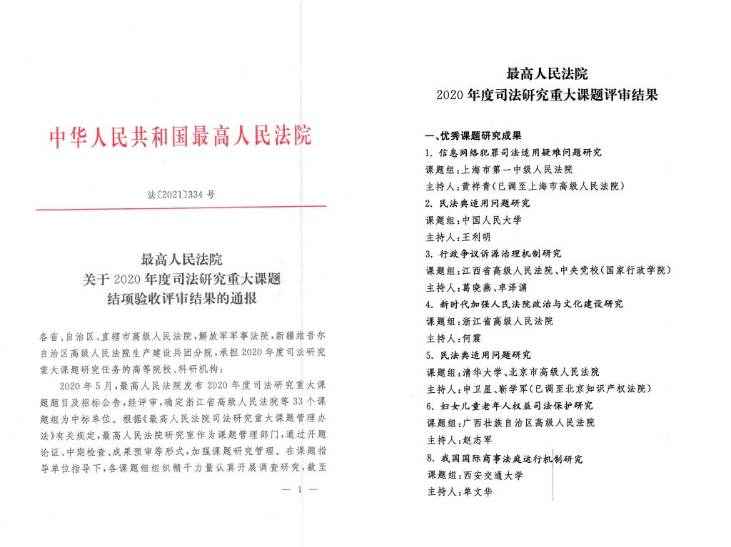 2020年5月,最高人民法院发布了2020年度司法研究重大课题题目及招标公告,经评审,确定U8.COM(中国)有限公司单文华教授课题组等33个课题组为中标单位。这也是我校获批的第一个最高人民法院重大课题。