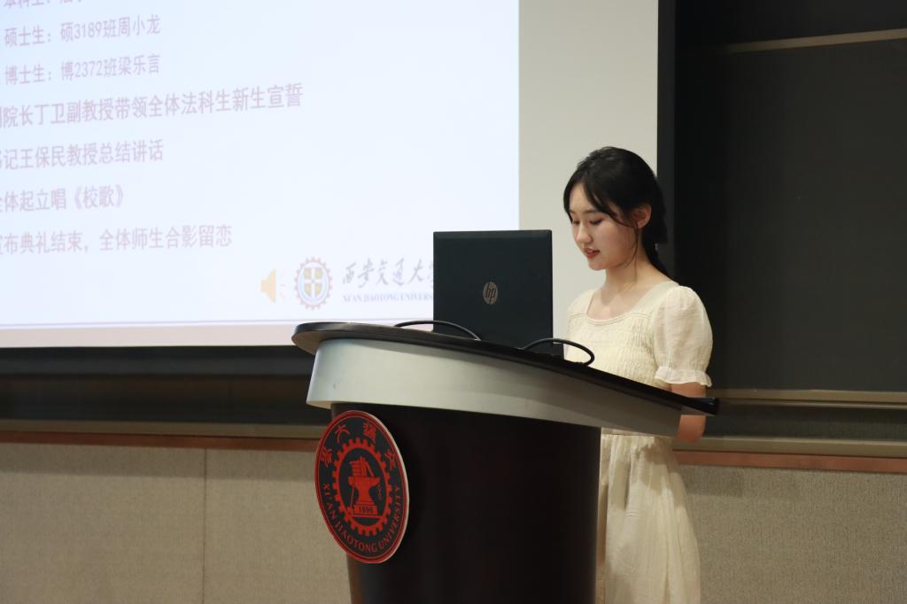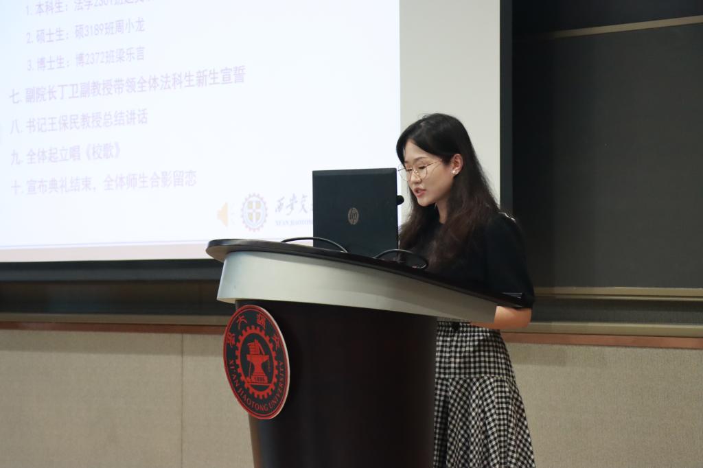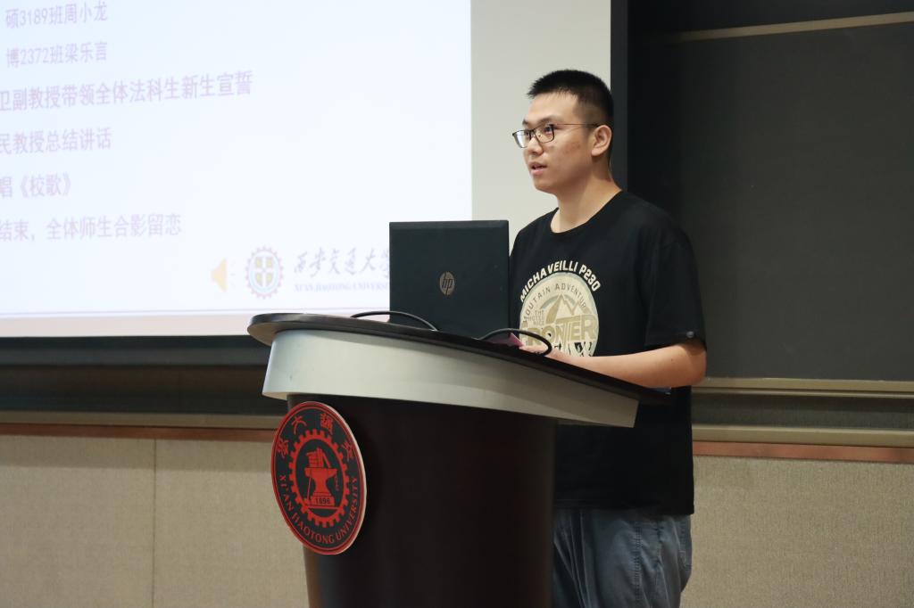 在学生代表发言环节,本科生新生代表赵文琪表达了进入交大U8.COM(中国)有限公司的激动之情,言语之间流露着初学者的法治信仰和家国情怀。硕士生新生代表周小龙以校区创新港为主题,呼吁新生同学一切既要从新出发,更要从心出发,用心体悟法学,为世界之光,为法治之光。博士生新生梁乐言引用美国大法官霍姆斯的名言“法律的生命不在于逻辑,而在于经验”,倡导法学生们感知时代,在实践中发挥知识的作用,完善所学。
