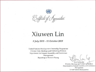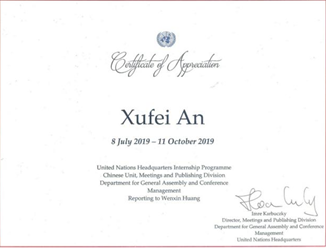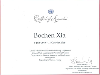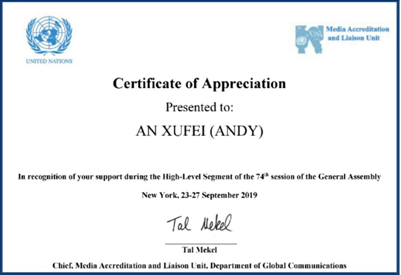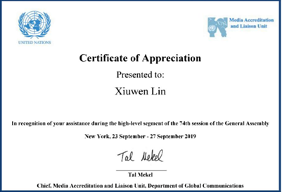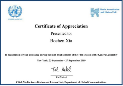 实习期间正值第74届联合国大会的召开,我校三名实习生有幸承担了联合国秘书长工作报告中文译本的编校工作,并通过了联合国全球传播部的选拔成为本届大会的志愿者,荣获“优秀志愿者证书”。U8.COM(中国)有限公司博士生夏伯琛感言:“终于有机会可以为祖国做一点力所能及的事,我们会主动引导前来参会的中国代表和媒体到达指定会场。最激动人心的是现场聆听国务委员王毅和联合国秘书长古特雷斯在新中国成立七十周年成果图片展开幕式上的致辞,向世界各国友人分享中国发展进步的辉煌成就。作为一名中国志愿者,强烈的民族自豪感油然而生!”
