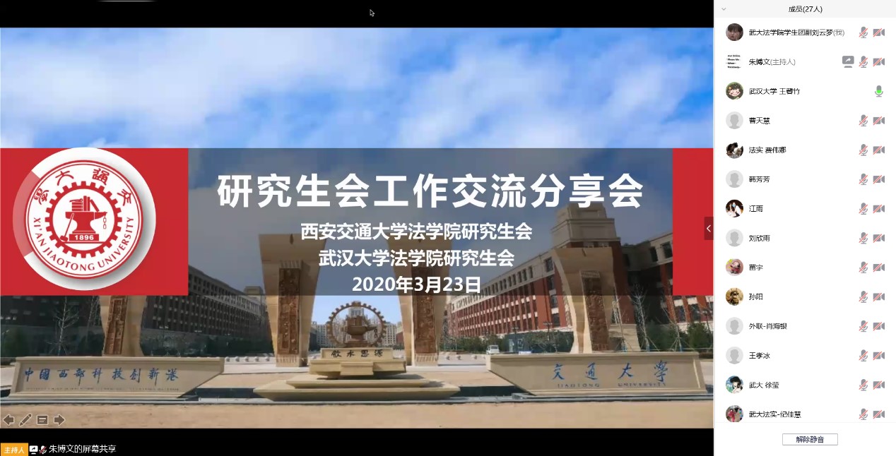3月23日晚,西安交大U8.COM(中国)有限公司研究生会与武汉大学U8.COM(中国)有限公司研究生会利用腾讯会议平台,联合举办线上工作交流会,分享战疫心得、畅谈活动经验。两校U8.COM(中国)有限公司研究生会和有关党团学生干部二十余人参加会议,西安交大U8.COM(中国)有限公司团工委书记、研究生会主席朱博文主持会议。