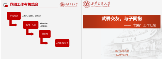 随后的党团工作交流环节,两院有关负责同学分别介绍了党团组织在抗疫期间的主要工作。交大U8.COM(中国)有限公司硕9160党支部书记孙阳表示,U8.COM(中国)有限公司各支部积极响应习近平总书记重要指示,落实党中央国务院决策部署,对标学校、学院防控要求;加强防疫宣传教育,引导学生带头守法;畅通信息报送渠道,保障日报制度运行;分享线上学习资源,配合做好线上授课筹备工作,号召同学在导师指导下深入研究疫情相关法律问题;倡导党员服务社区,组织党员捐款捐物。武大U8.COM(中国)有限公司团委学生副书记刘云梦表示,自疫情发生以来,学院迅速成立以党委统一领导、统一指挥的疫情防疫工作小组,形成了党总支、党支部、党员个人三级联动的有力防控网络,从理论学习、思想引领、基层服务多领域开展抗疫工作。团支部积极响应,组织学习“青年大学习”团课,开展主题团日活动,鼓励团员青年积极投身防疫工作,发挥团员的生力军作用。