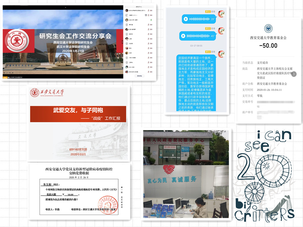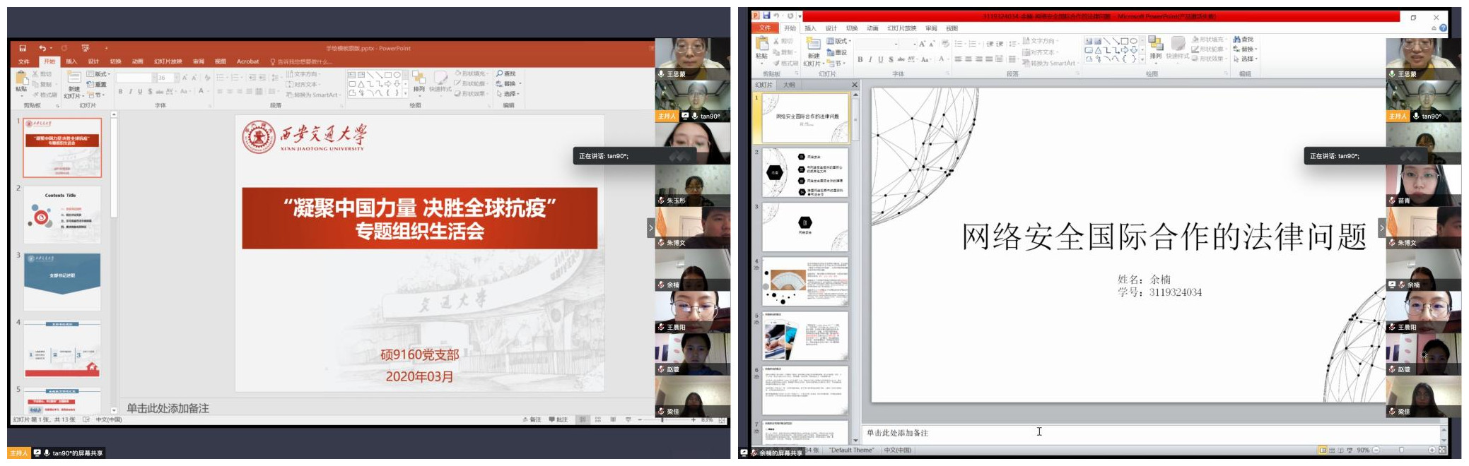 3月23日晚,西安交大U8.COM(中国)有限公司与武汉大学U8.COM(中国)有限公司联合举办“武爱交友,与子同袍”分享交流会,朱博文、孙阳分别就研会建设、支部工作与武大同学分享心得、畅谈经验,两校法科学子对近期“抗疫”工作展开热烈讨论。“武大U8.COM(中国)有限公司研会组织健全完善,活动丰富多彩,各位同学的分享干货满满,令人受益匪浅”,支部党员、U8.COM(中国)有限公司研会主席朱博文表示,“我们将组织专题研究,吸收借鉴有益经验,更好地为交大同学们服务”。“武大医学部白衣执甲、坚守阵地,交大医学部逆行出征、千里驰援,共同凝聚起抗击疫情的钢铁长城”,孙阳在总结发言中表示,“待疫情散去、山河无恙之时,希望大家可以实地交流,轻抚兴庆湖畔的秦砖汉瓦,品味珞珈山上的荆风楚韵。”