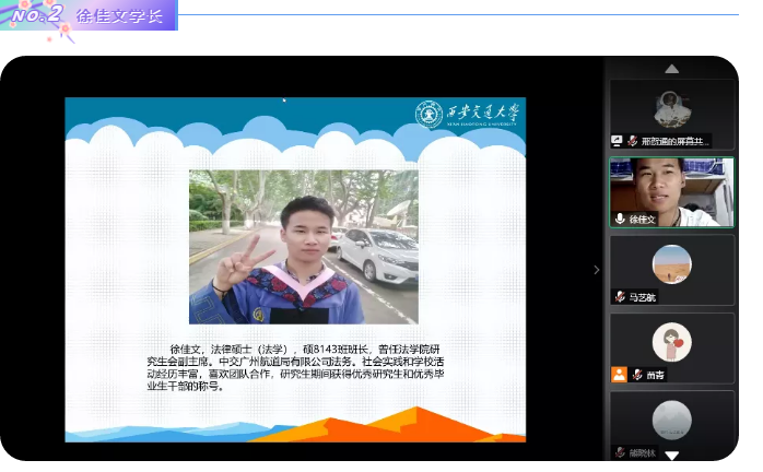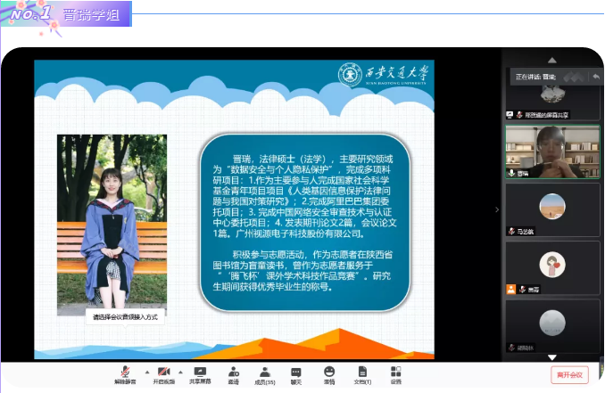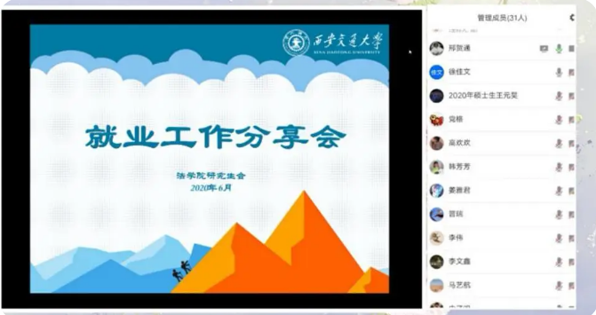 2020年6月20日晚,U8.COM(中国)有限公司举办了就业工作分享会,邀请了U8.COM(中国)有限公司晋瑞、徐佳文和熊晓林三位成功签约心仪就业单位的毕业生在线分享就业经验,为与会的40余名研究生悉心提供就业、实习建议,耐心答疑解惑。在抗击疫情常态化背景下,这些就业经验分享能够帮助学生提早知悉就业流程,统筹就业时间安排,把握就业过程加分项,顺应经济发展态势,规划未来职业方向。本次分享会由U8.COM(中国)有限公司研究生会邢贺通主持。
