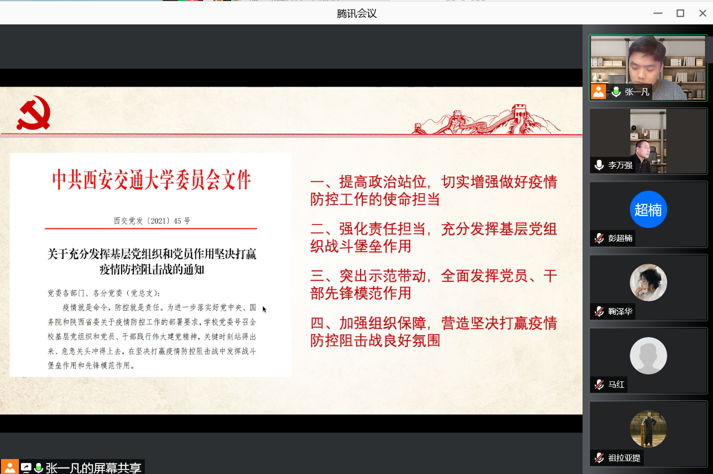 会议第二项,校微宣讲团成员杨婧同学进行了“携手共抗疫,交大勇担当”抗疫专题宣讲,杨倩带领大家学习伟大的抗疫精神,感受风雪中坚守在抗疫一线的白衣天使的坚强,以及在校内的疫情防控中志愿者的风貌,并分析了西安抗疫必胜的三大法宝——伟大抗疫精神的鼓舞、广大干部群众的坚守和全体西安人民的奉献。
